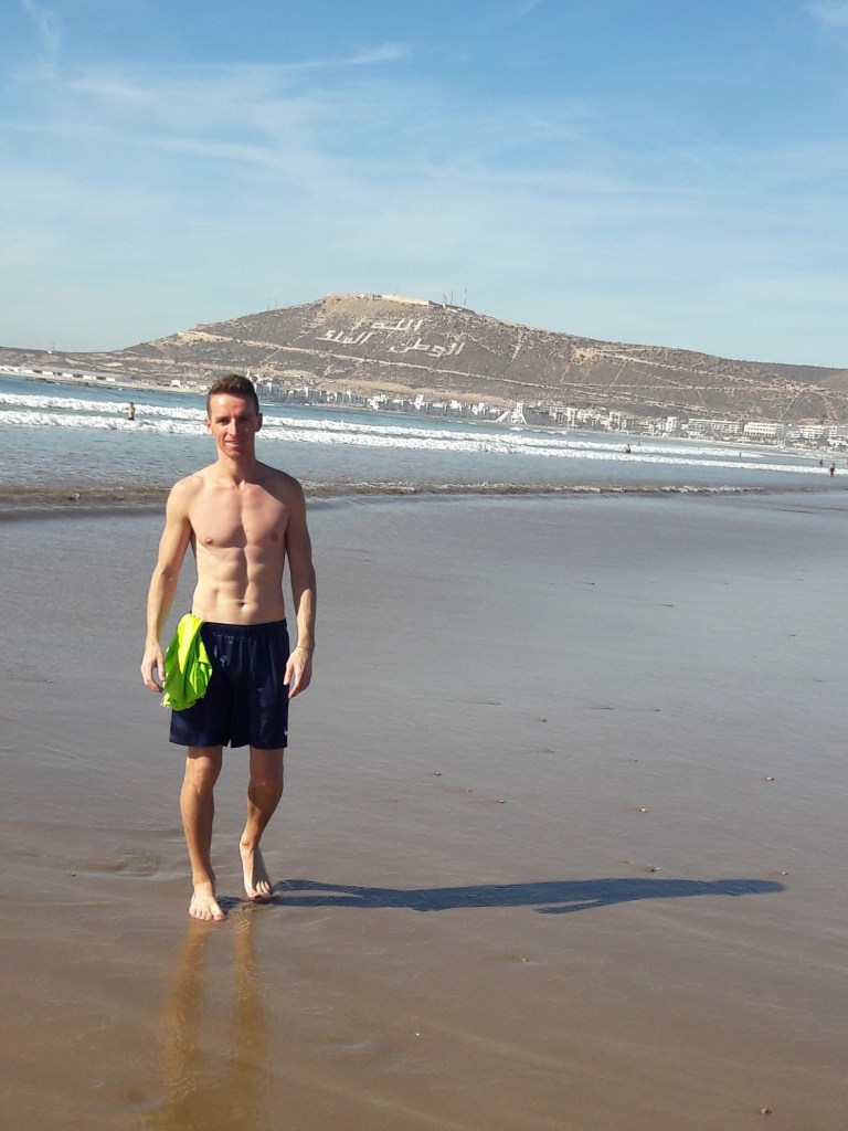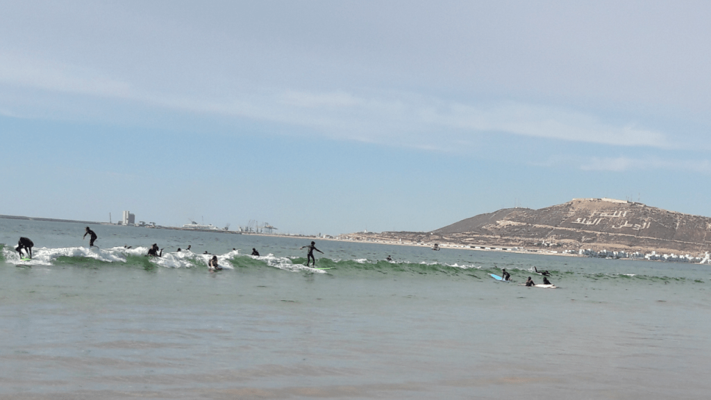 Na pláži bolo pomerne rušno, na piesku hrali marockí chlapci futbal a oceán bol plný surférov. Väčšina z nich ale podľa môjho názoru boli len amatéri, ktorých na tento šport nalákali miestne požičovne surfov.