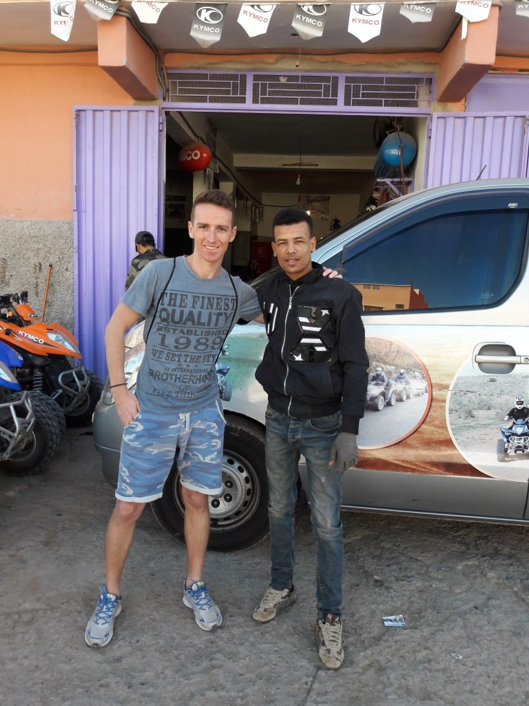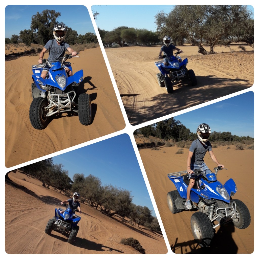 Nasledujúce ráno prišiel po mňa v malej čiernej dodávke chalan menom Rachid, ktorý ma odviezol asi 20km smerom do vnútrozemia, kde ma čakala zaujímavá zábavka – jazda na štvorkolke. Túto aktivitu som si našiel a objednal na nete ešte pred príchodom do Maroka. V aute sme sedeli len my dvaja. Rachid moc anglicky nevedel, tak sme boli celý čas potichu a počúvali rádio. Chvíľami som aj v aute premýšľal, či sa z tohto tripu ešte vrátim živý alebo ma marocká mafia rozpredá na orgány (žartujem). Cesta autom bola zaujímavá, prechádzali sme nejakými osadami, v ktorých sa miestami vytrácal asfalt a namiesto áut sme cestou obiehali oslíkov, až sme napokon dorazili na miesto, kde už stáli pripravené štvorkolky. Po krátkej inštruktáži ako sa ten pekelný stroj ovláda sme vyrazili. Môj inštruktor – mladý Maročan, ktorý neviem ako sa už volal, udával smer. Viedol ma ponad piesočné duny a po vyprahlej hrboľatej ceste, na ktorej tá štvorkolka nadskakovala jak pokrievka na hrnci. Občas sa obzrel, aby sa uistil, či som sa ešte nezdrbal a ukazoval mi prstom, či som si všimol okolo sa pasúce kozy. Bolo vidno, že jazdí každý deň, lebo mi popri tom všetkom ešte aj stíhal robiť mobilom fotky, ktoré ani neboli rozmazané. A možno som len ja šiel jak dosratý, tak to pre neho bola brnkačka, kto vie.