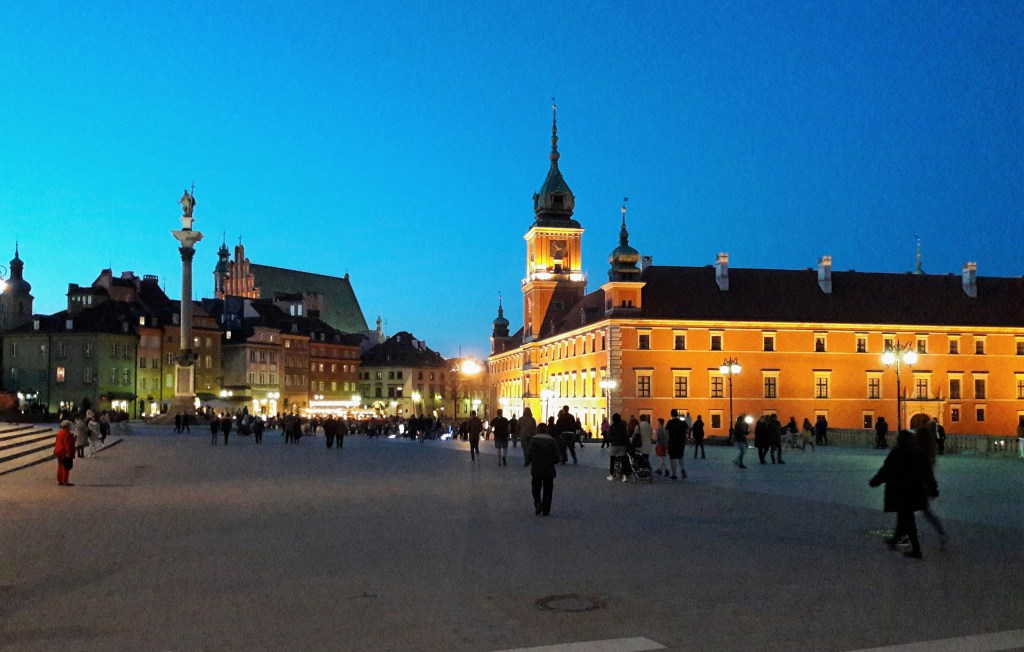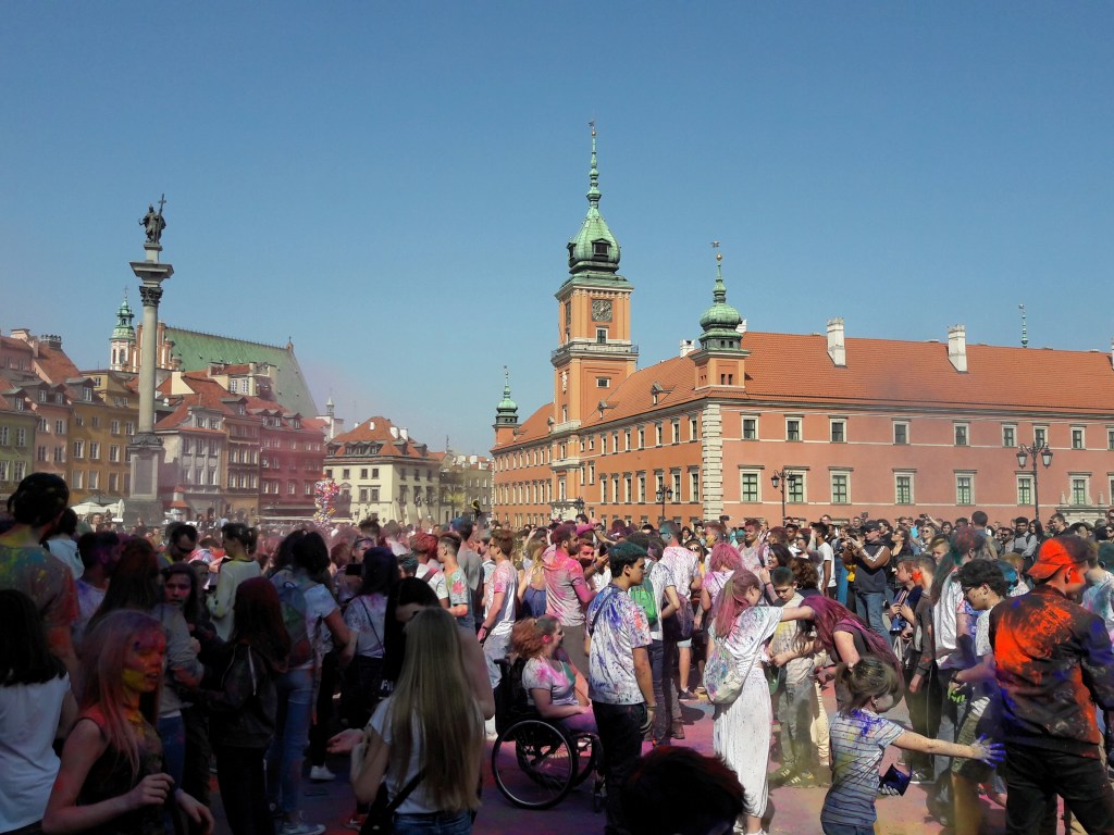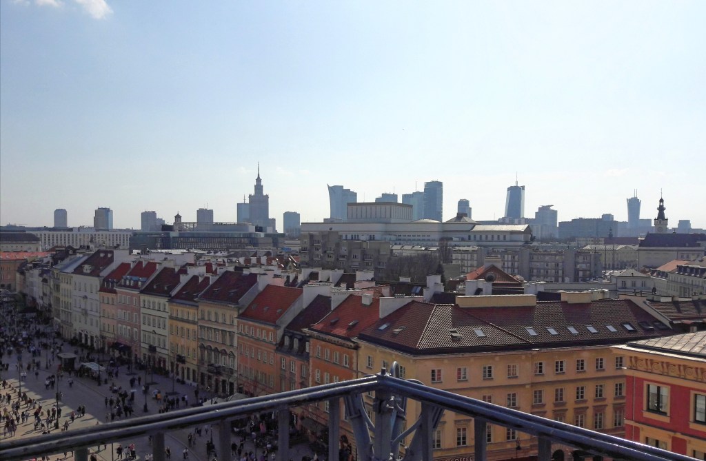 Ten deň sme ešte znovu zamierili do starého mesta, ktoré je vždy plné ľudí. V to popoludnie ich tam bolo ešte raz toľko jak po iné dni, lebo sa konala nejaká akcia, pri ktorej sa všetci zúčastnení obhadzovali farebným prachom jak pri tých behoch s názvom Colour Run. My sme sa nechceli zamazať, skôr ešte trocha namazať a pred tými farebnými bláznami sme utiekli hore do bezpečia na rozhľadňu Taras Widokowy, odkiaľ je na celé historické námestie ale aj široké okolie úžasný výhľad. V diaľke nad mestom sme zbadali aj varšavské mrakodrapy a tiež dominantu mesta – Palác kultúry a vedy, ktorý sme navštívili nasledujúci deň. Nachádza sa v tej modernejšej časti mesta, kde je množstvo mrakodrapov a nákupných centier. Svoju “kravinu” tu použil Maťo a zatiahol nás na pár minút do jedného z nich, lebo si potreboval kúpiť nové rifle.