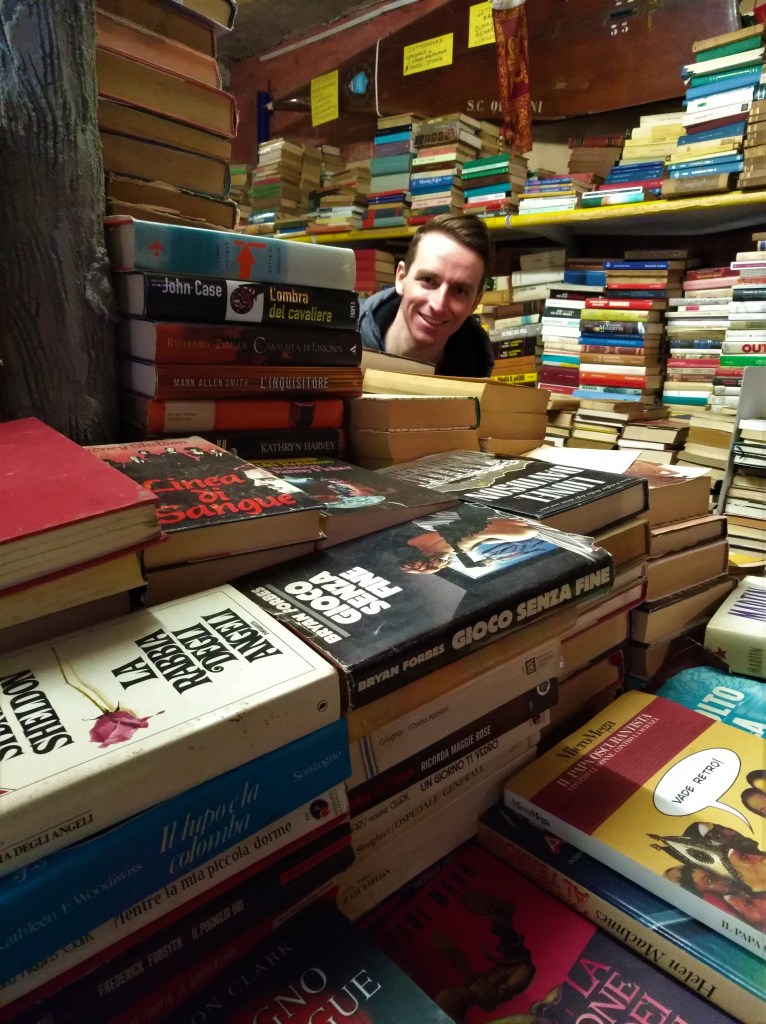 Popoludní sme navštívili antikvariát Libreria acqua alta. Tisíce kníh naukladaných jedna cez druhú vytvárali komíniky, ktorých statika musela byť labilná jak duševná rovnováha Seleny Gomez. Nechápem, že sa tam tie knižné mrakodrapy ešte na nikoho nezrútili. Na druhej strane, keby ma zavalí taká masa kníh, aspoň neumriem sprostý, nie? Liberia acqua alta je taký turistický antikvariát. Nie ako ten v Nekonečnom príbehu, kde by okrem jedného starého knihovníka čítajúceho a bafkajúceho fajku nebolo viac ani nohy. V tomto kníhkupectve bolo pomerne rušno. Ľudia sa tu okrem prehrabávania sa v knižkách fotili pri schodíkoch z kníh tzv. Book steps. Nie som síce žiadny knihomoľ či vášnivý čitateľ akým bol Bastian Balthazar Bux, ale aj pre mňa bolo toto miesto naozaj čarovné a pokiaľ budete niekedy v Benátkach a máte aký taký vzťah ku knihám, choďte sa tam určite pozrieť.