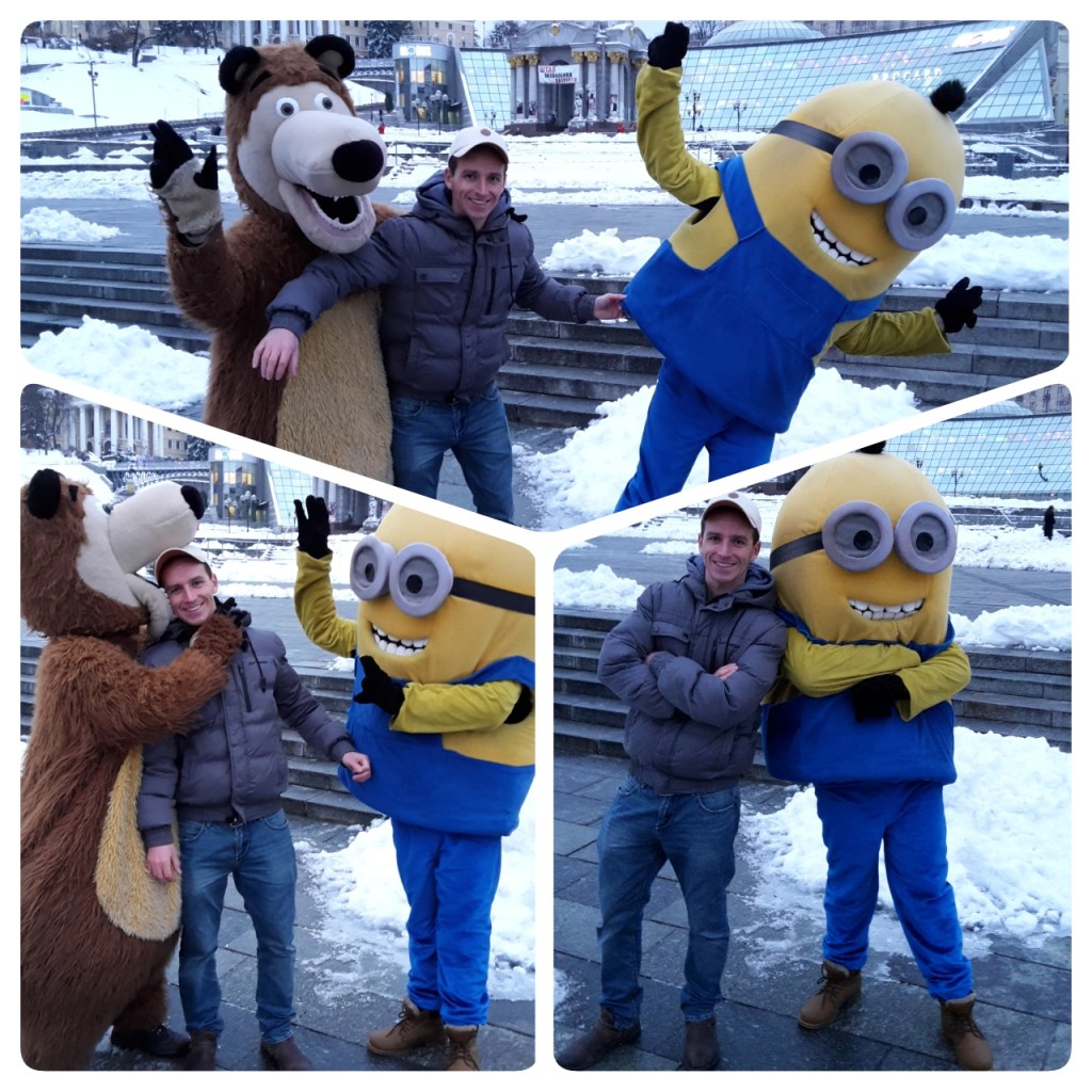 V ten deň som sa po dobrom neskoršom obede v Puzatej Hate vybral na menšiu prechádzku. Prišiel som až na kyjevské hlavné námestie Majdan Nezaležnosti, kde sa na mňa vrhli mimon, medveď a zebra. Ja vtedy ešte chlapec sveta neznalý som si myslel, že bude super spraviť si s nimi selfíčka. Tie zveri si ale potom odo mňa vypýtali 500 hrivien (cca 16€). Pozrel som nechápavo na nich, či to myslia vážne. Veď ja som len obyčajný chalan zo Slovenska a nie ruský magnát. Dal som im polovicu a zdrhol preč. Ale tak človek sa učí na vlastných chybách a teraz už viem, že keď na turisticky frekventovanom mieste stoja plyšové postavičky, tak je lepšie sa im vyhnúť. Prípadne, ak chcete mať s nimi vtipnú fotku, tak hneď na úvod treba zistiť, koľko za to tí vydriduchovia vlastne chcú.