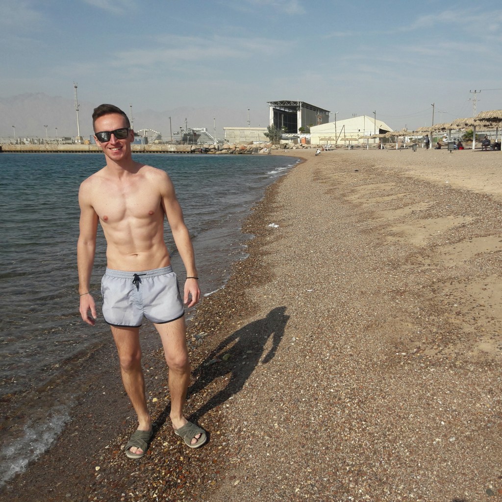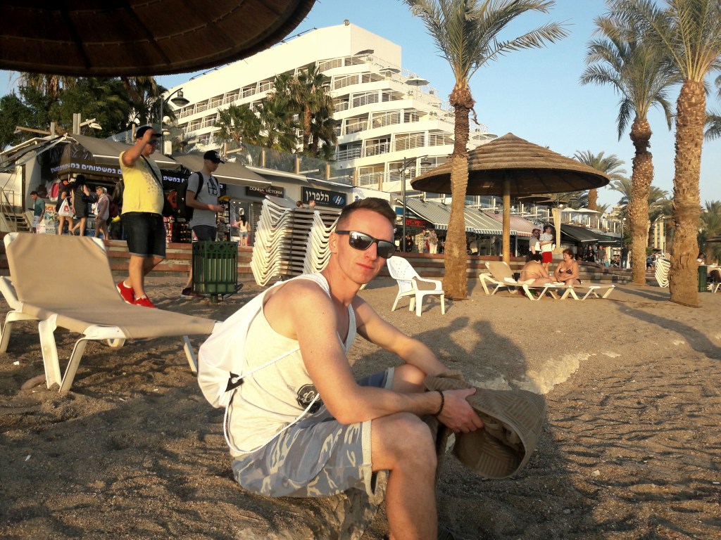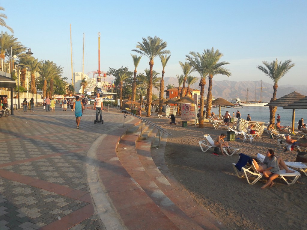Popoludní som mal v pláne oddychovať na pláži. Ešte pred tým som si však chcel pozrieť Piestany. Dobre čítate, v Eilate za hotelovou zónou sa totiž nachádza ulica s názvom Piestany, na ktorej som sa ako správny Piešťanec chcel zvečniť a spraviť trochu promo mestu snov. Keď nad tým tak premýšľam, Piešťany a Eilat majú veľa spoločného. Obe mestá poskytujú ideálne podmienky na oddych, rekreáciu a vodné športy a počas hlavnej turistickej sezóny sú všetky miesta na terasách reštaurácii a barov obsadené turistami, čomu samozrejme zodpovedajú aj premrštené ceny. A aj keď si myslia, že sú pupkom sveta, obe sú v podstate len zaprdené malomestá, kde sa pozná každý s každým, čo sa aj potvrdilo, keď som cestou znova natrafil na mojich slovenských spolubežcov. Aj chalani mali namierené na pláž, tak som sa k nim pridal a na tú ulicu som už potom ani nešiel. Pred plne obsadenými lehátkami v centre hotelovej zóny sme dali prednosť pláži s názvom Mosh’s beach Eilat vzdialenej asi 1,5 km. Celkom dobrá voľba, lebo tam skutočne nebolo ani nohy, dokonca aj v plážovom bare to zívalo prázdnotou. Rozložili sme si uteráky a niektorí z nás sa aj odhodlali vojsť do vody. Nebola síce najteplejšia, ale stále dobrá na kúpanie. Zdržali sme sa asi dve hodky a potom sa šli najesť späť do mesta, kým nám ešte nezavreli všetky bufety.