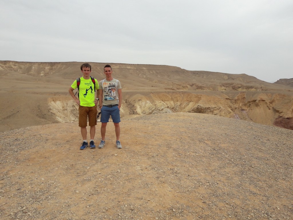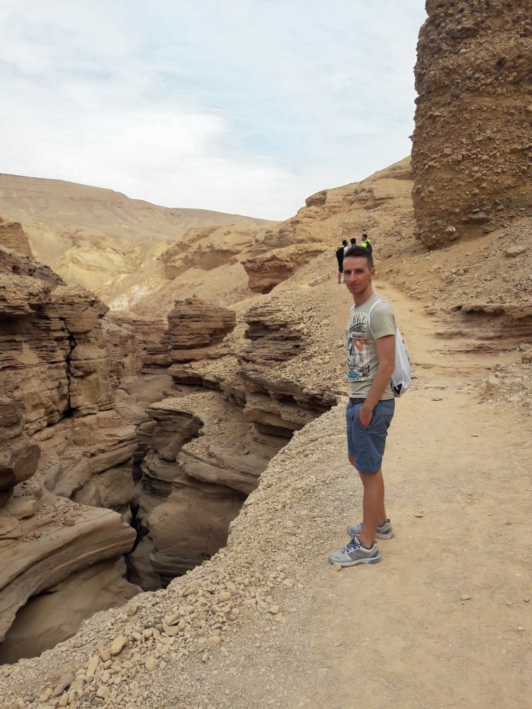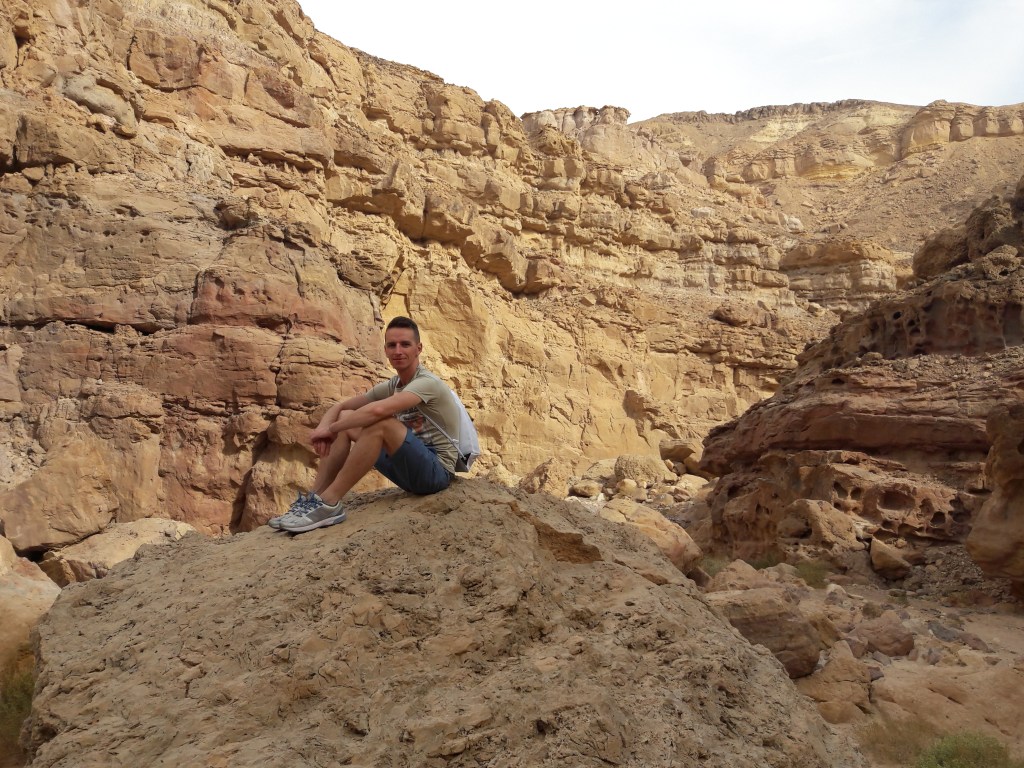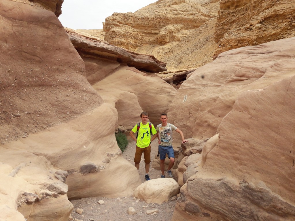 Eric sa s nami ráno už rozlúčil a pokračoval smerom do Tel Avivu. Maks mal svoj program a ja ani Valdemaras sme nemali chuť trčať na izbe, či len tak ležať na pláži. Tak sme sa spoločne vybrali do Red Canyonu. Cez týždeň sa tam dá dostať ľahko aj autobusom, no počas Šabatu nefunguje ani verejná doprava. V podstate to je taký malý blackout, keď život v meste takpovediac utíchne (asi jak čul). No kde je vôľa, tam je cesta. A my sme si spôsob ako sa do Red Canyonu dostať našli. Nič svetoborné sme samozrejme nevymysleli a šli sme tam jednoducho taxíkom. Vyšlo nás to spolu na 70 USD, ale zhodli sme sa, že nám to za to rozhodne stojí. Red Canyon je od Eilatu vzdialený asi 22km. Za necelých 20 minút nás taxikár vysadil na kraji cesty pred veľkou hnedou tabuľou s nápisom Red Canyon. Dali sme mu polovicu prachov a dohodli sa, že po nás o 3 hodiny príde. Mali sme teda dostatok času si tento krásny prírodný úkaz poriadne prezrieť. Pred nami nebolo nič len vyprahnutá púšť. Dúfali sme, že tie dve pollitrové fľašky vody nám budú stačiť a hlavne, že pán taxikár sa po nás zas vráti. Ale veď prečo by sa nemal, keď sme mu dali bez vyjednávania koľko si vypýtal. Isto sme mu spravili tržbu o akej po iné dni môže len snívať a tú druhú polku hotovosti mal samozrejme dostať až potom. Asi po pol hodine kráčania začalo byť okolie viac hrboľaté, tak sme vedeli, že Red Canyon už nebude ďaleko a mali sme recht. Dolu sa schádza pomocou rebríkov. Ale kto mal ako malý doma poschodovú posteľ to zvládne ľavou zadnou. Ja som z troch súrodencov, takže pre mňa to bola malina. A Valdemaras? Ten je zas velice zdatný športovec, ktorý bežne brázdi hrebene trojtisícoviek, takže toto pre neho nebola žiadna výzva. Ale teraz vážne, naozaj to zvládne aj 4-ročné dieťa, takže úplne bez obáv. Okolo nás nebolo takmer živej duše. Len občas sme stretli nejakého turistu. Keď už sme sa vracali späť, zbadali sme oproti nám kráčať skupinku ľudí. Moc dobre som na nich nevidel, lebo mi slnko svietilo do očí. Keď zrazu počujem jedného z nich kričať: „Dušááan!“ No myslel som, že sa mi sníva. Boli to naši spolubežci zo Slovenska. Celkom nás toto milé stretnutie pobavilo. Svet je ozaj malý. Chalani si od nejakého známeho či hostiteľa (už si nepamätám) požičali auto a šli sa pozrieť do známeho Timna parku. No a cestou odtiaľ sa stavili aj tu. Miesto pre nás už v aute nemali, ale my sme mali aj tak odvoz zabezpečený. A nechceli sme, aby sa taxikár o nás strachoval, keby nás (a hlavne druhú polovicu sľúbených zelených esíčok) už neuvidí. Vrátili sme sa dokonca o 15 minút skôr a napäto čakali, čo s nami bude. Náš tátoš ale prišiel načas a odviezol späť do Eilatu. Poviem vám, neviem si veru predstaviť krajšiu bodku za mojím izraelským dobrodružstvom. I keď ešte nie koniec. Čaká ma predsa cesta domov.