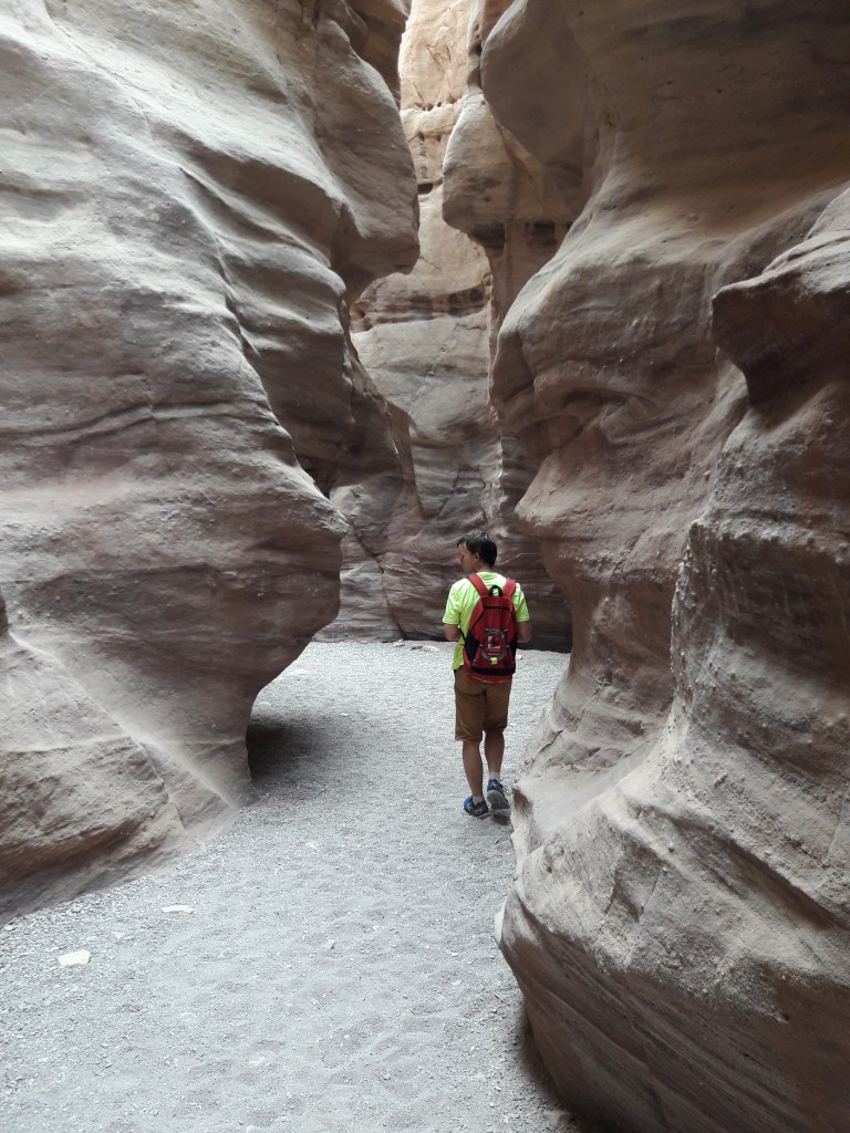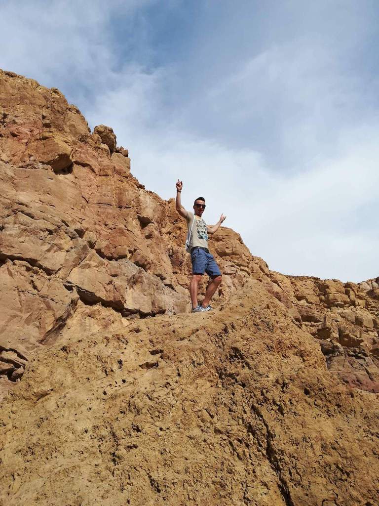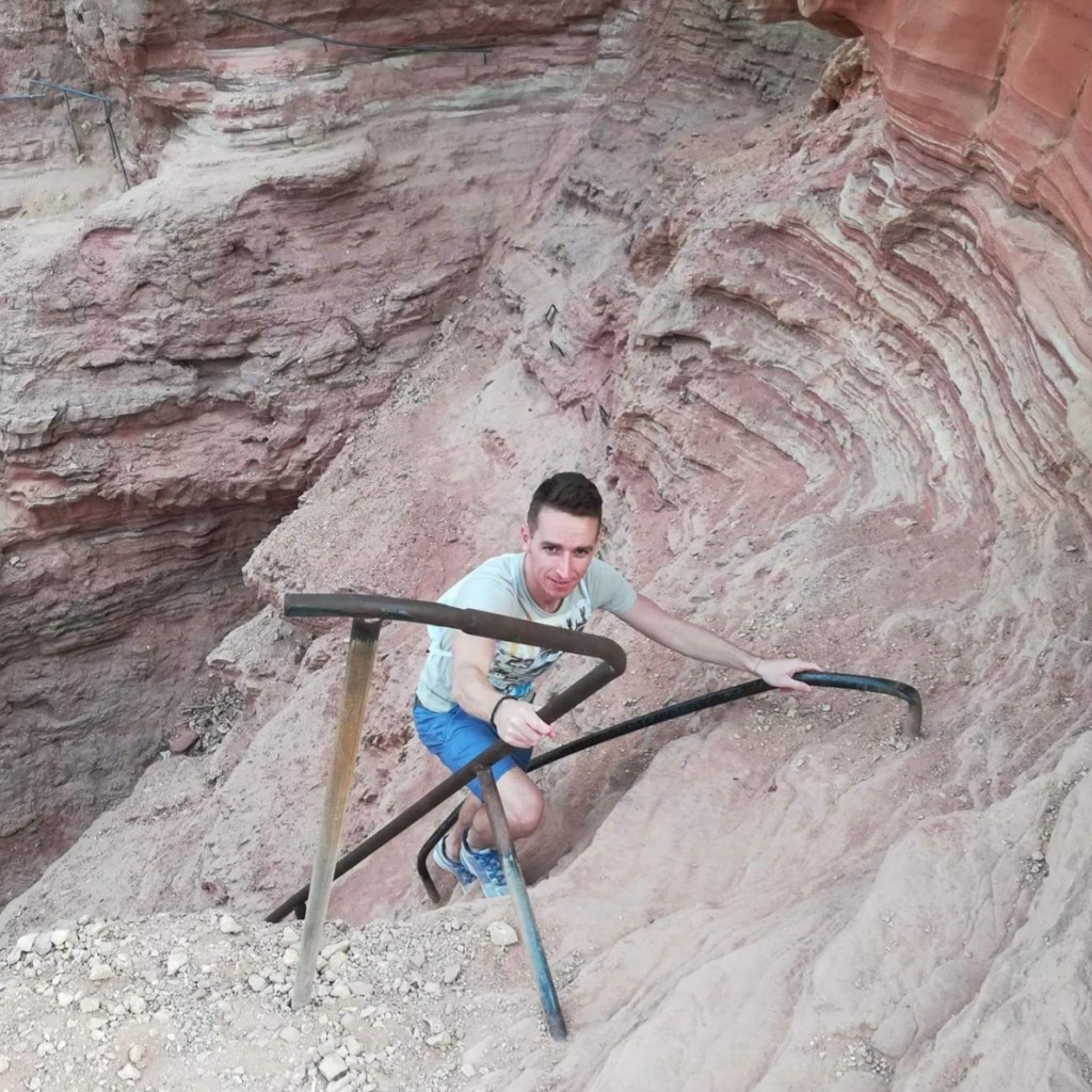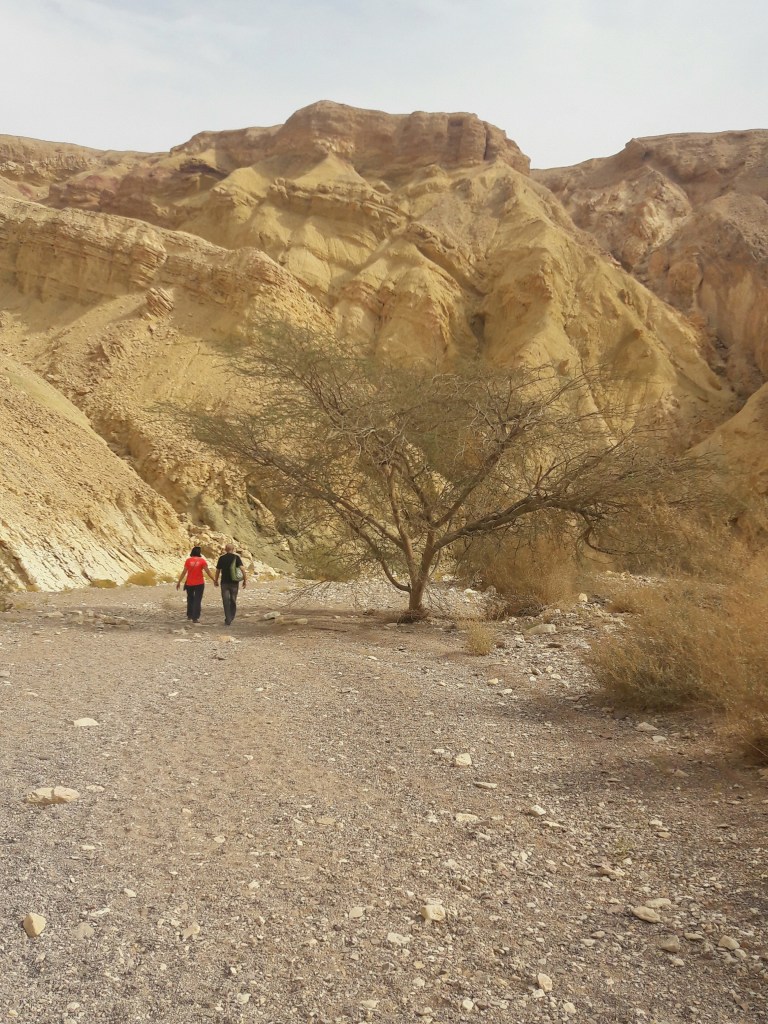 Eric sa s nami ráno už rozlúčil a pokračoval smerom do Tel Avivu. Maks mal svoj program a ja ani Valdemaras sme nemali chuť trčať na izbe, či len tak ležať na pláži. Tak sme sa spoločne vybrali do Red Canyonu. Cez týždeň sa tam dá dostať ľahko aj autobusom, no počas Šabatu nefunguje ani verejná doprava. V podstate to je taký malý blackout, keď život v meste takpovediac utíchne (asi jak čul). No kde je vôľa, tam je cesta. A my sme si spôsob ako sa do Red Canyonu dostať našli. Nič svetoborné sme samozrejme nevymysleli a šli sme tam jednoducho taxíkom. Vyšlo nás to spolu na 70 USD, ale zhodli sme sa, že nám to za to rozhodne stojí. Red Canyon je od Eilatu vzdialený asi 22km. Za necelých 20 minút nás taxikár vysadil na kraji cesty pred veľkou hnedou tabuľou s nápisom Red Canyon. Dali sme mu polovicu prachov a dohodli sa, že po nás o 3 hodiny príde. Mali sme teda dostatok času si tento krásny prírodný úkaz poriadne prezrieť. Pred nami nebolo nič len vyprahnutá púšť. Dúfali sme, že tie dve pollitrové fľašky vody nám budú stačiť a hlavne, že pán taxikár sa po nás zas vráti. Ale veď prečo by sa nemal, keď sme mu dali bez vyjednávania koľko si vypýtal. Isto sme mu spravili tržbu o akej po iné dni môže len snívať a tú druhú polku hotovosti mal samozrejme dostať až potom. Asi po pol hodine kráčania začalo byť okolie viac hrboľaté, tak sme vedeli, že Red Canyon už nebude ďaleko a mali sme recht. Dolu sa schádza pomocou rebríkov. Ale kto mal ako malý doma poschodovú posteľ to zvládne ľavou zadnou. Ja som z troch súrodencov, takže pre mňa to bola malina. A Valdemaras? Ten je zas velice zdatný športovec, ktorý bežne brázdi hrebene trojtisícoviek, takže toto pre neho nebola žiadna výzva. Ale teraz vážne, naozaj to zvládne aj 4-ročné dieťa, takže úplne bez obáv. Okolo nás nebolo takmer živej duše. Len občas sme stretli nejakého turistu. Keď už sme sa vracali späť, zbadali sme oproti nám kráčať skupinku ľudí. Moc dobre som na nich nevidel, lebo mi slnko svietilo do očí. Keď zrazu počujem jedného z nich kričať: „Dušááan!“ No myslel som, že sa mi sníva. Boli to naši spolubežci zo Slovenska. Celkom nás toto milé stretnutie pobavilo. Svet je ozaj malý. Chalani si od nejakého známeho či hostiteľa (už si nepamätám) požičali auto a šli sa pozrieť do známeho Timna parku. No a cestou odtiaľ sa stavili aj tu. Miesto pre nás už v aute nemali, ale my sme mali aj tak odvoz zabezpečený. A nechceli sme, aby sa taxikár o nás strachoval, keby nás (a hlavne druhú polovicu sľúbených zelených esíčok) už neuvidí. Vrátili sme sa dokonca o 15 minút skôr a napäto čakali, čo s nami bude. Náš tátoš ale prišiel načas a odviezol späť do Eilatu. Poviem vám, neviem si veru predstaviť krajšiu bodku za mojím izraelským dobrodružstvom. I keď ešte nie koniec. Čaká ma predsa cesta domov.