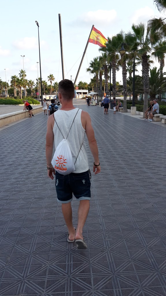 Bežcami sa to hemžilo aj na promenáde mestskej pláže La Malvarrosa, kde sme chodili tak na dve hodky najskôr však po 16-tej, lebo aj začiatkom septembra vo Valencii ručička teplomera neklesla počas dňa pod 30 stupňov a keby vystavíme naše biele postavičky obedňajšiemu ostrému slnku, tak sú z nás rázom dve fašírky. Po meste sme sa túlali väčšinou pešo, no na pláž sme sa vždy radšej odviezli MHD-čkou. Hneď vedľa nášho hotela bola zastávka, odkiaľ jazdili autobusy smerom k pobrežiu takmer každých 15 minút. Valencia rovnako ako aj jej známejšia sestra Barcelona sa hrdo pýši jednou z najlepších mestských pláží v Európe. Nájdete tu všetky možné bary, reštaurácie, sprchy, vécka, prezliekacie kabínky a jednoducho kopec služieb, ktoré človek potrebuje na to, aby tu mohol oddychovať hádam aj celý deň. My ale nie sme typy, ktoré vydržia dlho len tak ležať na piesku a nič nerobiť. Párkrát sme sa šľahli do mora, na dôkaz spravili niekoľko plážových fotiek, dali si po pive v plážovom bufete a šli sa radšej prejsť k mólu, odkiaľ je mimochodom na celú Playa de la Malvarrosa úžasný výhľad.
