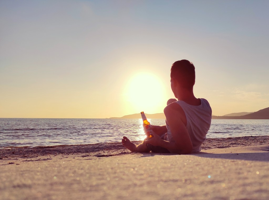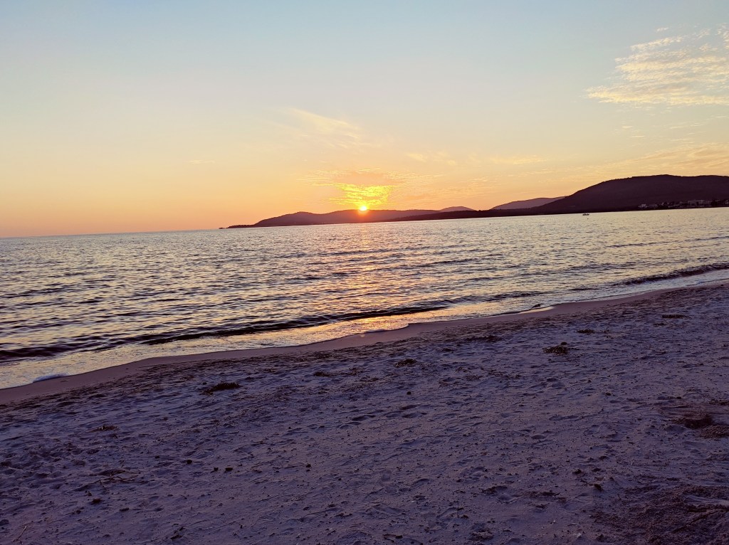 Ako som písal, tak s Mariou Piou som to nevzdal a vrátil som sa sem pred západom slnka cestou z dokonalej La Pelosy. Keďže bolo celý deň slnečno, tak som tentokrát už nepotreboval žiadnu mikinu ani si nemusel zakrývať oči pred vetrom. Bolo krásne teplo, bezvetrie a na oblohe ani mráčik. V prázdnom bare na pláži som si kúpil fľaškové pivo, sadol do piesku a užíval si slnečné lúče až pokým sa predo mnou Oskar úplne nestratil v oceáne. Jednoducho dokonalé. Krajšie som si svoj posledný večer na Sardínii ani len nemohol predstaviť.