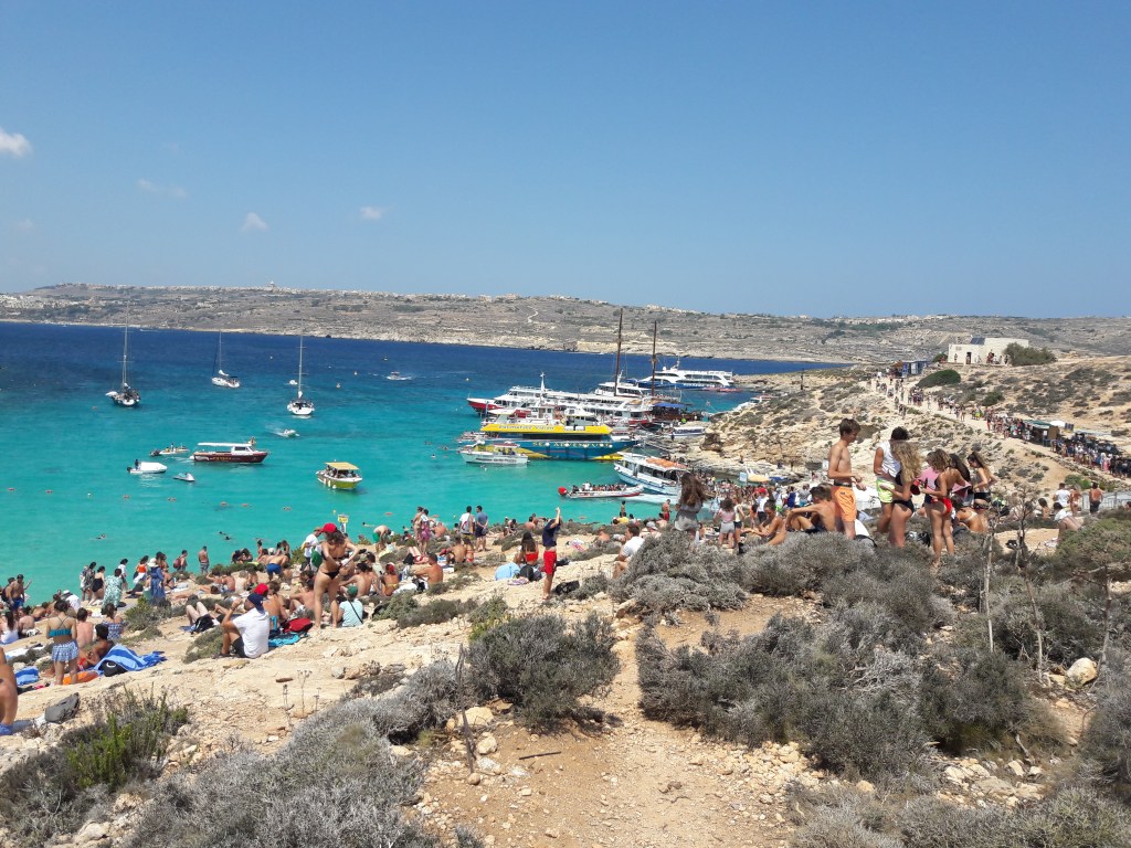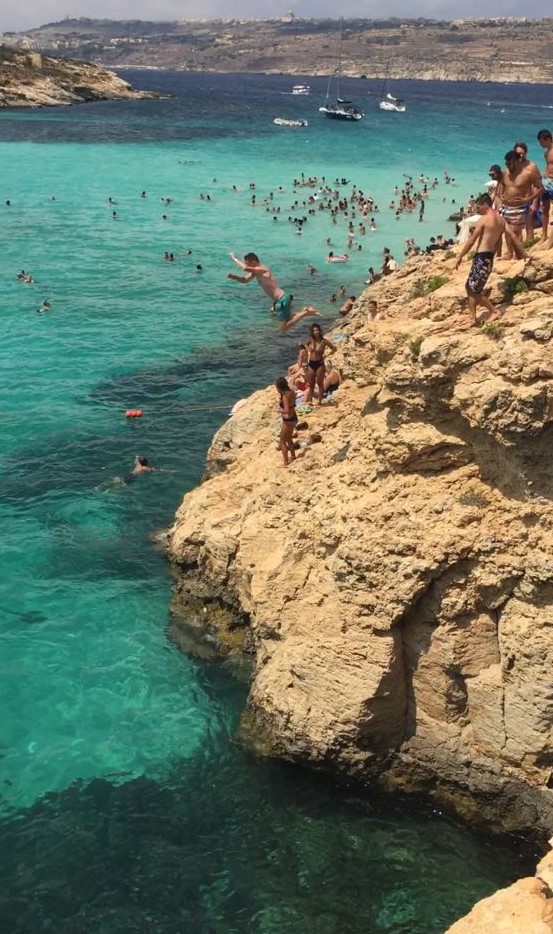 Nasledujúci deň sme sa vybrali na výlet loďou okolo ostrova Comino, aby sme na vlastné oči videli bájnu Modrú lagúnu. Je to jedna z najkrajších pláží na Malte. I keď počas leta je neskutočne plná turistov, ktorých tam jak na páse vyvážajú výletné lode. Kto by čakal rajskú pláž ako z filmu Návrat do Modrej lagúny, asi by bol mierne sklamaný a zrejme sa sem už ani nikdy nevráti. Ja som nemal žiadne očakávania a tak aj napriek sardinkárni som bol milo prekvapený. Nie, že by som bol nejak zvlášť zcestovaný ale prisamfakt belasejšie more som ešte nikde v Európe nevidel. Lagúna (ako aj väčšina pobrežia Malty) je tvorená skaliskami a útesmi, takže do vody sa väčšinou vchádza na vyhradených miestach za pomoci rebríka. Aj preto je Malta miestom, ktoré vyhľadávajú milovníci skokov do vody. V Modrej lagúne sme si túto mierne adrenalínovú aktivitu vyskúšali aj my. Je to parádny zážitok, ale každý by mal poznať svoje limity a pred skokom do mora aplikovať staré známe – Dvakrát meraj a raz rež, aby sa apetít za akciou neskončil repatriáciou.