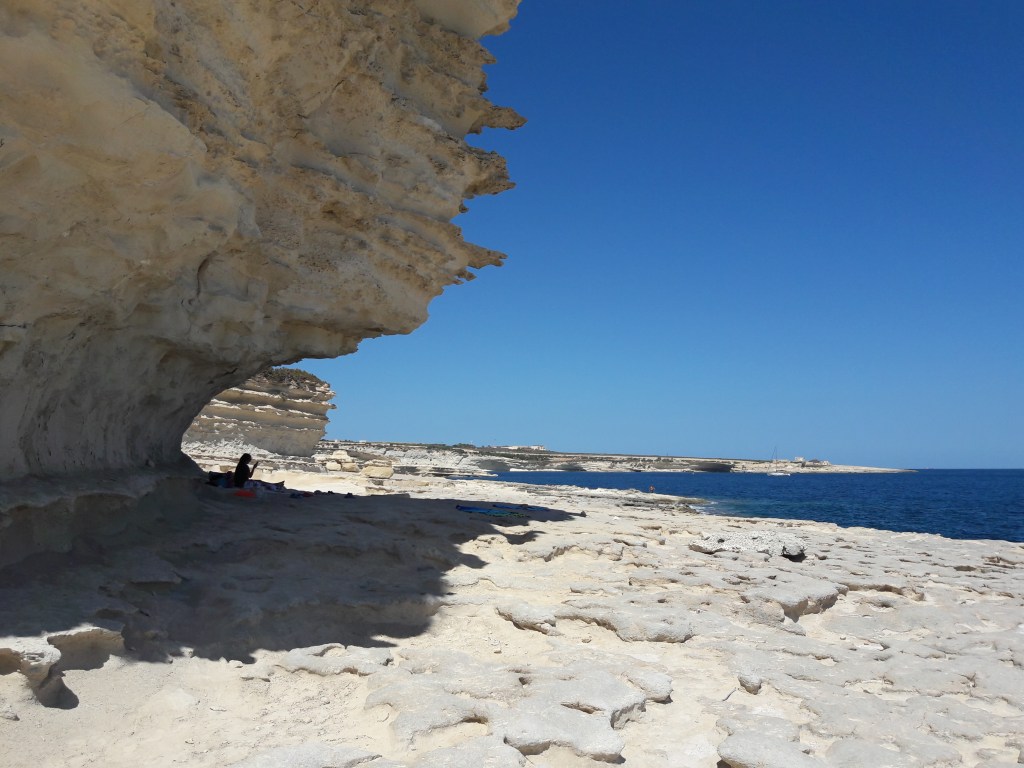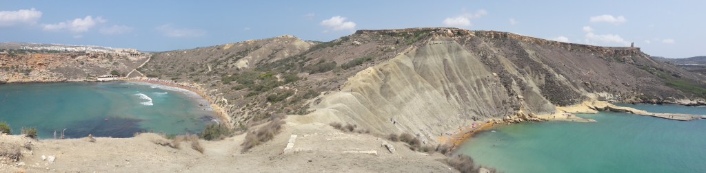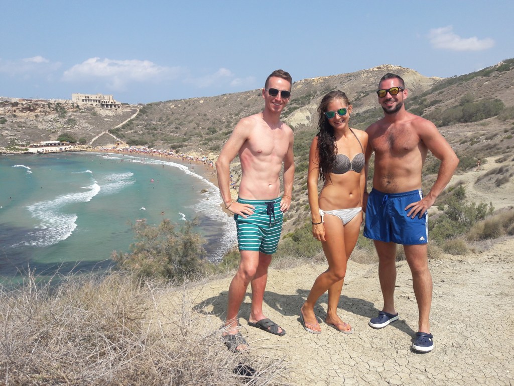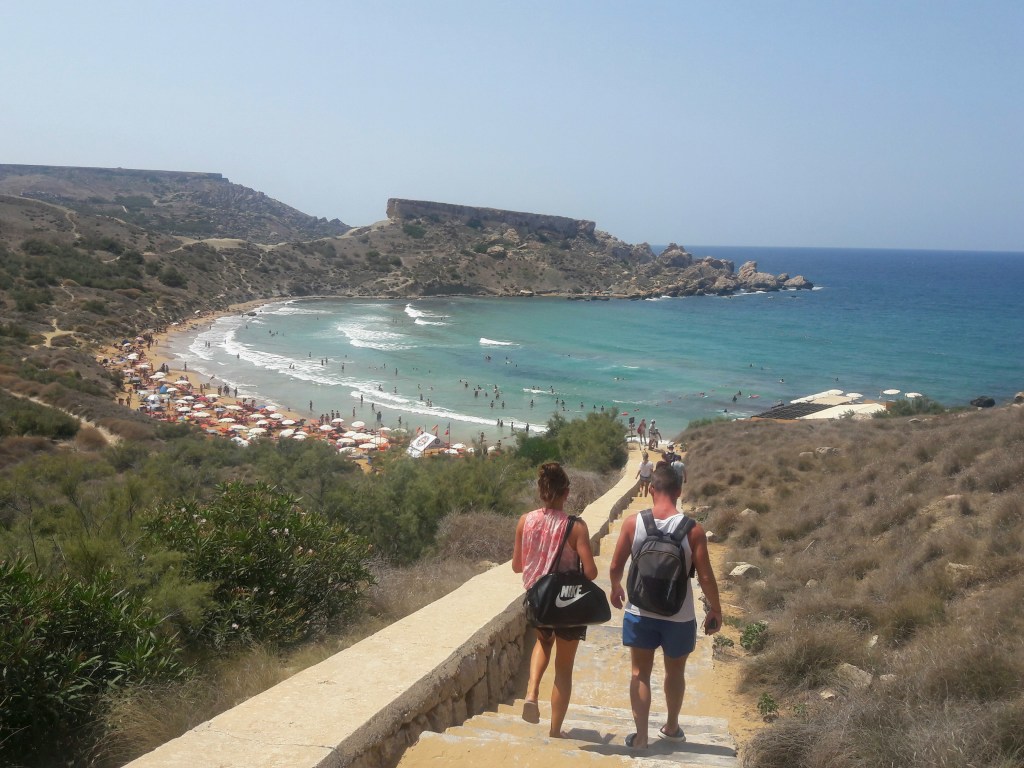 Na hoteli v Melliehe sme sa zoznámili s Češkou Terezou, ktorá pracovala ako čašníčka v bare. Cez voľné popoludnie sa s nami vybrala autobusom na pláž Ghajn Tuffieha v severozápadnej časti ostrova, ktorá je mimochodom jedna z mála piesočných pláží na Malte. Koho omrzí kúpanie, môže sa poprechádzať po okolitých útesoch, odkiaľ je na pláž krásny výhľad. Aj my sme boli spoločne preskúmať okolie a cez kopec prešli do vedľajšej zátoky Qarabba Bay. Je tam malá a pomerne „secret“ pláž, kde si môžte bez problémov doopalovať svoj biely zadok. Museli sme vyšľapať hore kopečkom a potom zijsť dolu strmým štrkovo-piesočnatým svahom. Odmenou za vynaložené úsilie nám ale bola takmer prázdna pláž, pretože väčšine ľudí ani len nenapadne merať sem cestu. Čakanie na autobus cestou späť na hotel sme si skrátili trhaním opuncií, ktoré rastú po celom ostrove. Chutia ozaj výborne, akurát že tie pichliačiky z nich som mal na prstoch a prirodzení ešte týždeň po prílete na domov…