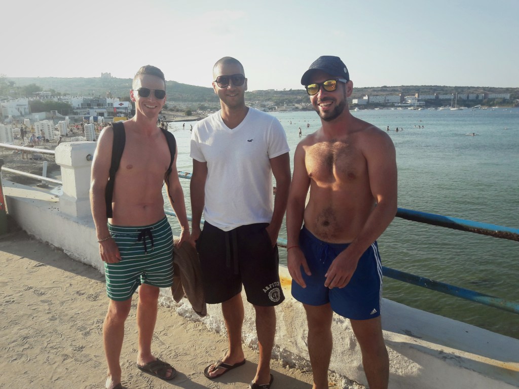 Prvé 4 noci sme si bookli v hoteli pri najväčšej maltskej pláži Ghadira Bay v Melliehe, kde sme sa mali stretnúť s Angelom. Keď som ho zbadal, bol už opálený na cigánka a hlavne ja som pri ňom svietil jak chrup Ľuba Višňovského. I keď je pravda, že Angelo, ktorému po otcovi prúdi v žilách arabská krv sa ani opaľovať nemusí. Za to ja sa dohneda neopálim nikdy a pred slnkom som sa schovával ako sa len dalo. Marcel ten ho pre zmenu zas vyhľadával. Vždy keď som na bazéne roztiahol slnečník, hodil na mňa vražedný pohľad ala Achmed the dead terrorist a bolo mi hneď jasné, že ak sa chcem dožiť ďalšieho dňa, tak ten slnečník musím vrátiť do pôvodného stavu. Ghadira bola teda prvá pláž, ktorú sme na Malte skúsili. Nájdete tu všetko vybavenie, ktoré typický plážový dovolenkár potrebuje, no moja šálka kávy to rozhodne nie je a sú tu oveľa krajšie zákutia.